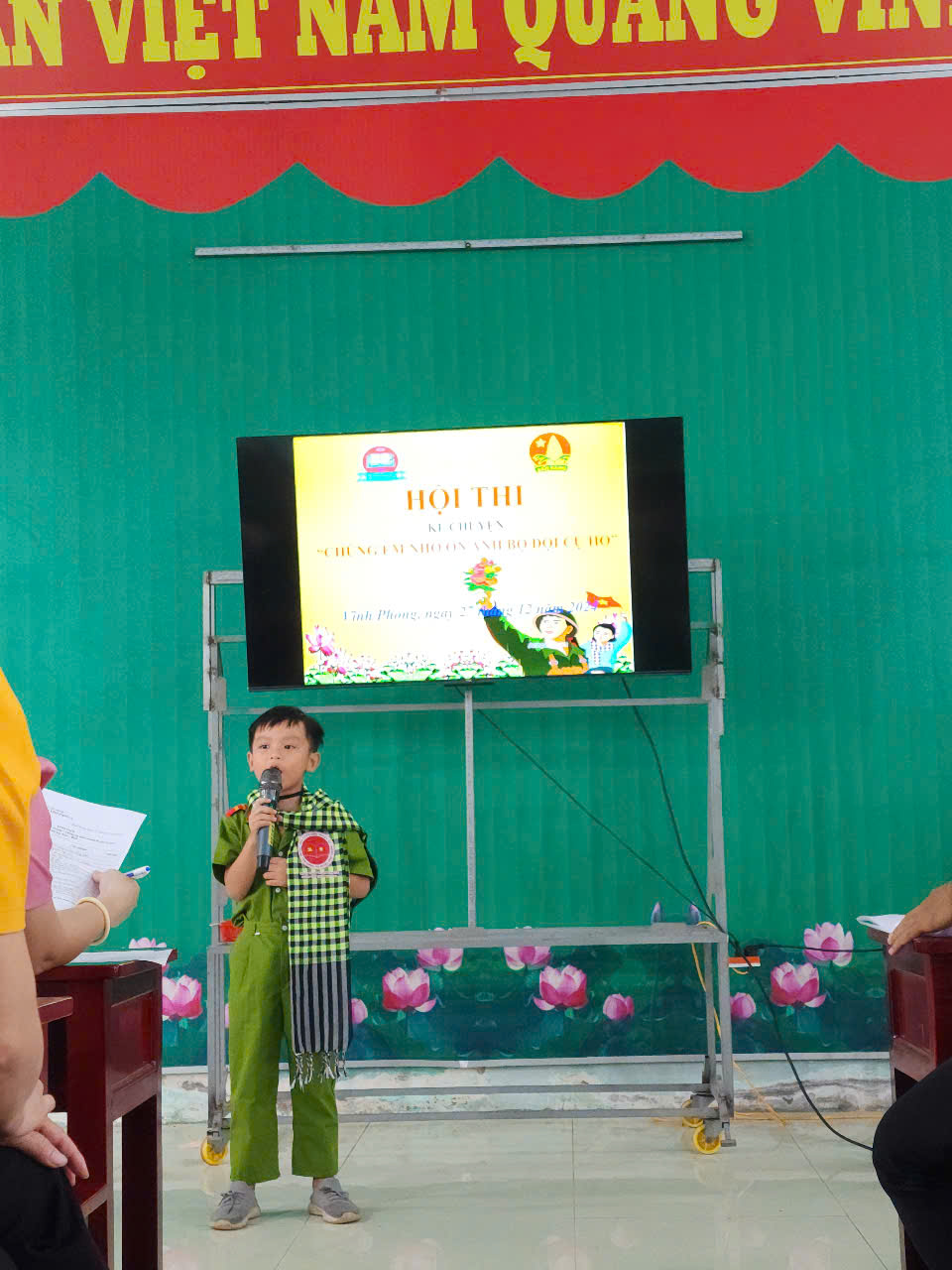 Sáng hôm đó, sân trường rộn ràng cờ hoa và tiếng nhạc. Các bạn học sinh từ khối 1 đến khối 5 đều háo hức chuẩn bị cho phần thi kể chuyện. Mỗi lớp cử một bạn đại diện tham gia, ai cũng có giọng kể truyền cảm và ánh mắt đầy cảm xúc khi nhắc đến Bác Hồ. Có bạn kể chuyện Bác nhường cơm cho bộ đội, có bạn kể về lần Bác gửi thư khen học sinh chăm ngoan, có bạn lại kể về tình yêu thương đặc biệt mà Bác dành cho thiếu nhi.